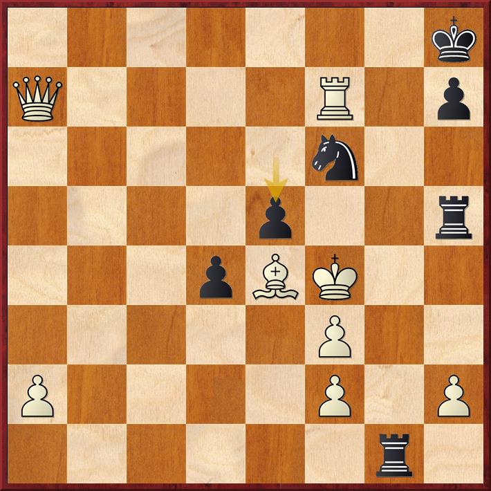 Daan speelde hier 28… Tg8! wat ook de enige zet is om de stelling in evenwicht te houden en had zijn volgende zet ook al in het vizier. Na het vervolg 29.Dxa7 (beste zet) speelde Daan 29… Dg5+! 30.Txg5 Txg5+ 31.Kh3 Th5+ (allemaal gedwongen zetten) en toen ging wit (Scott Verschoor) jammerlijk de fout in. Hij koos voor 32.Kg3?? misschien in de overtuiging dat hij uit de schaaks zou kunnen lopen? (32.Kg2 eindigt namelijk in remise na 32…Tg5+ 33.Kh3 Th5+). Maar nu loopt wit mat na 32.Kg3?? Tg1+ 33.Kf4 e5 MAT!