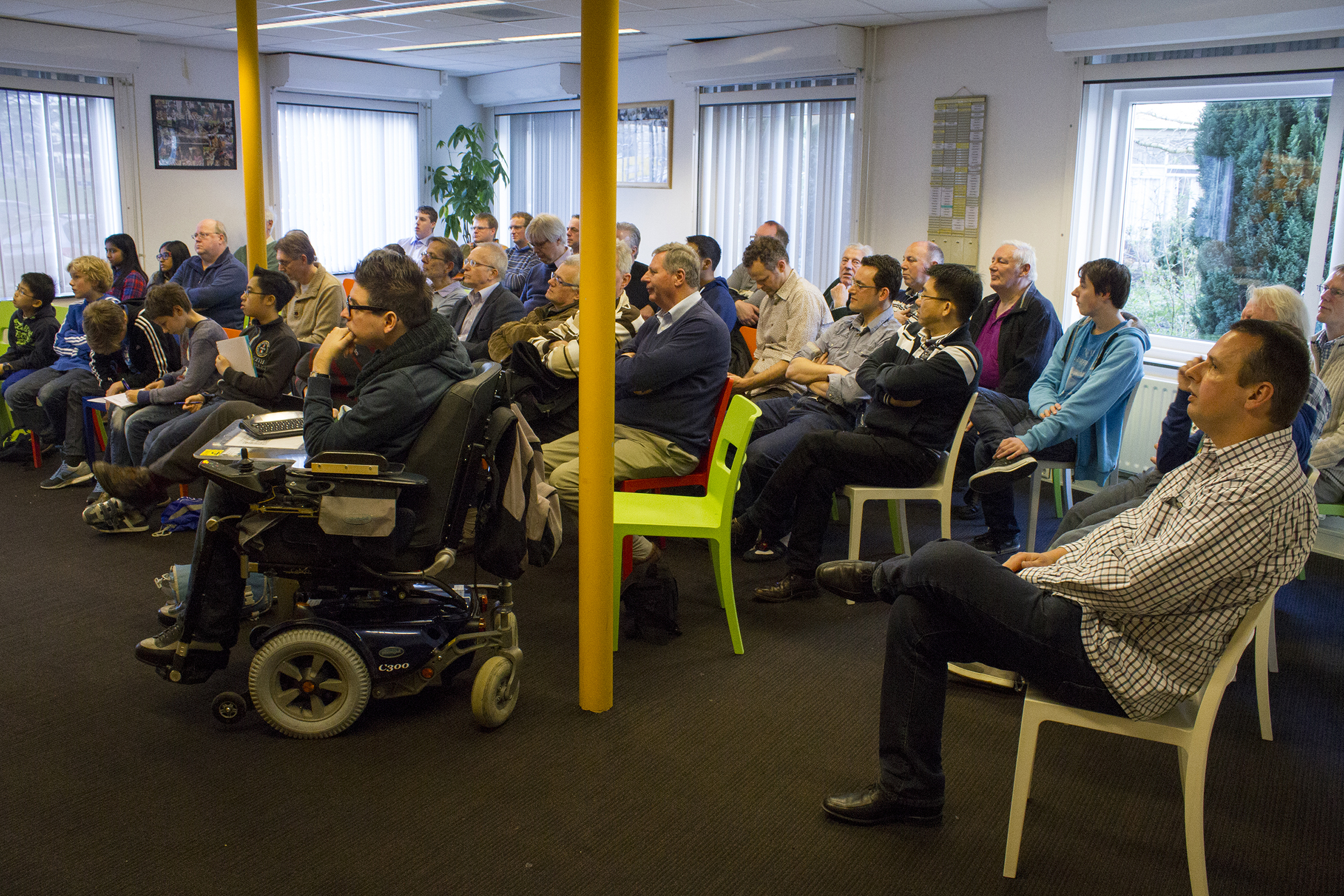 Jan Timman is 9 keer Nederlands kampioen geworden en heeft jarenlang in de top 3 van de wereld gestaan. Er was plaats voor een 80 deelnemers, verdeeld over 2 sessies van 1,5 uur. Naast de leden en oud-leden van SG Overschie was de training ook bedoeld voor alle andere belangstellenden. De opkomst was erg goed en een aantal jeugdtalenten en andere leden die de eerste sessie hadden bijgewoond, konden door in de zaal nog wat meer stoelen bij te plaatsen, ook de tweede sessie volgen. Tijdens de eerste sessie (rating tot 1600) liet de grootmeester twee van zijn recente partijen op een groot schaakbord zien. In de tweede sessie (rating vanaf 1600) liet Jan Timman een aantal door hem zelf gecomponeerde en zeer fraaie studies zien. Bij één daarvan verschenen er maar liefst vijf zwarte paarden op het bord. Gelukkig hadden wij nog een paar zwarte plastic paarden op stal staan. Ook nam Jan Timman tussen de sessies ruim de tijd om handtekeningen uit te delen, op de foto te gaan en zich een interview af te laten nemen door twee van onze jeugdleden. Het was een zeer aangename en leerzame middag.